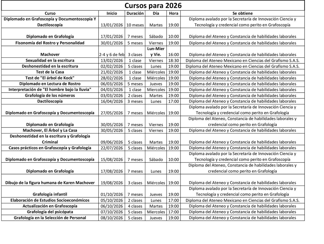 - Curso en en vivo o pregrabado vía Zoom con duración de 7 meses para formar Peritos en Grafología.